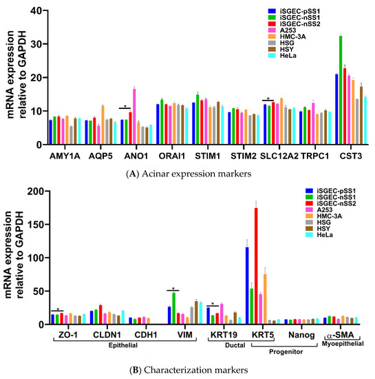 mRNA expression of acinar and characterization markers in monolayer cultured iSGECs, SGCLs, and HeLa cells by qRT-PCR. Legend. (A) Pro-acinar markers were highly expressed in all iSGECs. ANO1 and SLC12A2 were expressed highest in iSGEC-nSS2 compared to other iSGECs. (B) Characterization markers for epithelial, ductal, progenitor, and myoepithelial expression in all cell lines examined. The epithelial marker ZO-1 is an integral component of tight junctions and was overexpressed, whereas Vimentin (VIM) was under-expressed in iSGEC-nSS2. KRT-19, a ductal cell marker, was differentially expressed in iSGECs. * Indicates significant difference in expression determined by Student’s t-test (alpha = 0.05) and corrected using the Holm–Šidák method. Error bars represent mean +/− SEM.