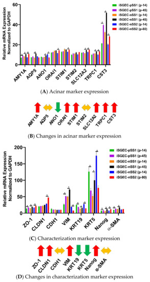 Changes in mRNA expression of early and late passaged iSGECs by qRT-PCR. Legend. mRNA expression of acinar (A) and characterization markers (C) in monolayer cultures of early and late passaged iSGECs by qRT-PCR (ΔCT). iSGECs increased in AMY1A (A), ZO-1 (C), and Nanog (C) in later passages. Changes in gene expression of iSGEC-nSS2 early (p-14) and late (p-80) are indicated with arrows: increased (red), decreased (green), and no change (yellow). (B,D) iSGEC-nSS2 differentially expressed several acinar and characterization markers in later passages. Significance of differences between the means was determined by Student’s t-test and p-values corrected using the Holm–Šidák multiple comparisons post hoc test (alpha = 0.05). Error bars represent mean +/− SEM. * p < 0.05.