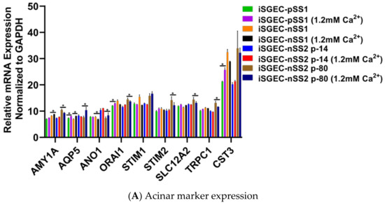 Calcium concentrations in media affect SGEC expression of pro-acinar genes, including AQP5, ORAI1, STIM1 and STIM2 [5,28]. Jang et al. demonstrated an increase in the activity of the store-operated Ca2+ entry (SOCE) system that upregulates AQP5 expression through the nuclear factor of activated T-cells 1 (NFAT1) [28]. To evaluate changes produced by an increase in Ca2+, we cultured iSGECs in 1.2 mM Ca2+ for three days and then assessed mRNA expression by qRT-PCR. Early iSGEC-nSS2 cultures (p-14) did not exhibit any alterations in expression of acinar markers when cultured in 1.2 mM Ca2+ (Figure 5A,B). Late iSGEC-nSS2 (p-80) cells supplemented with 1.2 mM Ca2+ demonstrated an increase in AQP5 and ANO1 mRNA expression and decreases in other acinar markers (AMY1A, ORAI1, STIM1, SLC12A2, TRPC1) (Figure 5A,B). Moreover, a change in ductal characterization marker KRT19 was decreased in p-14 iSGEC-nSS2 cells cultured in 1.2 mM Ca2+ (Figure 5C,D). Late (p-80) iSGEC-nSS2 responded differently via an increased expression of tight junction component ZO-1 and myoepithelial marker α-SMA. The lack of response to 1.2 mM Ca2+ in iSGC-nSS2 p14 cells reiterates the possibility of a de-differentiated cell population seen in Figure 4A,B, where p-80 demonstrated a response to increased Ca2+ that was more similar to other SGEC publications [5,28].
