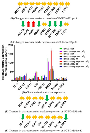 Changes in mRNA expression mediated by 1.2 mM Ca2+. Legend. Changes in acinar (A–C) and characterization markers (D–F) gene expression in iSGECs when cultured in 1.2 mM Ca2+ for 72 h. Changes in gene expression of iSGEC-nSS2 are indicated with arrows: increased (red), decreased (green), and no change (yellow). (B) iSGEC-nSS2 p-14 did not display changes in expression whereas late passaged (p-80) exhibited increases in acinar markers AQP5 and ANO1. AMY1A, ORAI1, STIM2, SLC12A2, and TRPC1 expression decreased in 1.2 mM Ca2+ p-80 cells. (C) Overall, characterization markers exhibited little change in 1.2 mM Ca2+ supplemented medium. (D) Ductal cell marker (KRT19) decreased in early passage (p-14) iSGEC-nSS2 to levels similar in late (p-80) cells. Conversely, ZO-1 and α-SMA expression decreased in later passaged (p-80) iSGECs with 1.2 mM Ca2+ and did not change in early (p-14) cells. Results calculated by Student’s t-test and p-values corrected by the Holm-Šídák multiple comparisons post hoc test (* p < 0.05). Error bars represent mean +/− SEM.