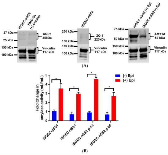 Protein expression of acinar and epithelial cell markers by Western blot in iSGEC-nSS2. Legend. (A) Protein expression of acinar (AQP5) (left) and epithelial (ZO-1) (middle) markers in whole-cell lysate of monolayer cultured iSGEC-nSS2. (left) Expression of AQP5 in iSGEC-nSS2 whole-cell lysate compared to HMC-3A, which was used as a (+) control for AQP5 in Western blots. (right) After stimulation with 10 µM epinephrine for 45 min ((+) Epi) cell culture supernatant was replaced, and cells were grown for 72 h before media were collected and concentrated. Cells without stimulation by media supplementation with 10µM epinephrine ((−) Epi) served as the control. Secreted α-amylase was detected in both stimulated ((+) Epi) and unstimulated ((−) Epi) cultures. 10µM epinephrine stimulated ((+) Epi) iSGEC-nSS2 cultures exhibited higher levels of α-amylase in cell culture supernatant than unstimulated cultures after 72 h. Western blots were normalized to vinculin expression in whole-cell lysate of their respective sample. (B,C) Media were harvested after stimulation with 10µM epinephrine for 45 min and amylase activity measured by colorimetric assay. (B) Supernatant of monolayer cultured iSGECs treated with 10µM ((+) Epi) had significantly higher α-amylase activity compared to untreated cells ((−) Epi). (C) Comparison of early (p-14) and late (p-80) passaged iSGEC-nSS2 secretion of α-amylase into media when cultured on matrigel. Results are listed as fold-change over the untreated control. Significance of differences between means was determined by Student’s t-test and p-values corrected using the Holm–Šidák multiple comparisons test (alpha = 0.05). Error bars represent mean +/− SEM. * p < 0.05.