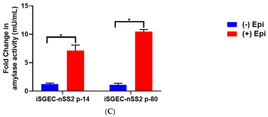 In all three iSGEC lines, α-amylase was secreted into the cell culture medium after β-adrenergic stimulation by epinephrine (Figure 6B). Additionally, iSGEC-nSS2 early (p-14) and late passages (p-80) secreted α-amylase into cell culture media with and without β-adrenergic stimulation (Figure 6B). iSGECs-nSS2 p-80 secrete α-amylase, demonstrating retention of pro-acinar cell characteristics after significant cellular expansion. Moreover, iSGEC-nSS2 cells cultured on matrigel formed spheroid structures and secreted α-amylase in response to 10 mM epinephrine stimulation (Figure 6C). An overall increase in α-amylase secretion when compared to unstimulated cells was observed in iSGEC-nSS2 and could indicate a stricter regulation of secretion within the differentiated cells.