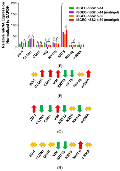 Early (p-14) and late (p-80) passaged iSGEC-nSS2 cells expressed AQP5 at higher levels in spheroid cultures (Figure 8B,C), possibly indicating a greater extent of differentiation and therefore displaying increased heterogeneity. However, the expression of characterization marker KRT19 decreased while VIM expression increased in iSGEC-nSS2 cells cultured on matrigel. Higher VIM expression may indicate an increase in stemness properties by dedifferentiation, along with reduced KRT19 expression (differentiated ductal cell marker), which could also indicate an increase in stemness [26,44]. Similarly, changes in VIM and KRT19 expression were observed in long term 2D cultured (p-80) cells (Figure 4D). Overall, dedifferentiation of iSGEC-nSS2 cells in both 2D and 3D cultures is likely associated with their high growth and differentiation potentials when cultured on matrigel. Last, iSGEC-nSS2 could offer an in vitro alternative for salivary gland developmental research due to its dedifferentiation properties.