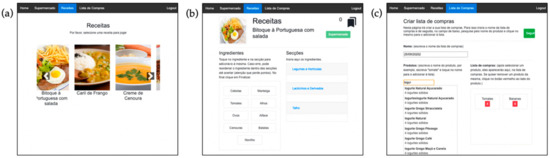(a) View of the recipe game mode; (b) extra step of difficultly in the recipe game mode, in which users have to organize the ingredients (left side of the screen) under the corresponding category (right side of the screen); (c) view of the shopping list game mode with two products included in the list.