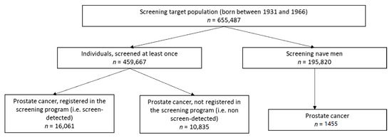 As seen in the flow chart of the study cohort (Figure 2), 16,061 (56.7%) prostate cancer cases were registered within the screening programme and 10,202 (38.2%) prostate cancers were observed among men who participated in the screening programme at least once, however, prostate cancer was not registered within the program. Overall, 5.8% (=26,896 out of 459,667) of screened men were diagnosed with prostate cancer as compared to 0.7% (=1455 out of 195,820) among screening-naïve individuals. In the group of registered as non-screen detected cancers, 60% of cases were PSA test-positives and prostate cancer diagnosis was reported shortly after the last screening test (median 97 days).