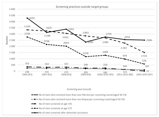 Screening practices among men aged 45 to 49 years are reported in Supplementary Table S1. PSA ≥ 3 ng/mL were detected in 6.3–7.3% of tested men and prostate cancer was confirmed in 0.3–1.5% of tested individuals. Screening practices outside target groups are shown in Figure 3. A steadily decline in unnecessary screening activities was observed within screening rounds over the time. Among the screened men between 50 and 74 years 3.6% received more than one PSA test in the first round (3339 out of 92,896 = 3.6%) and 0.7% in the seventh screening round (1511 out of 223,958 = 0.7%). Between 236 (first round) and 107 (last round) men received more than one biopsy per screening round. Among older than 74-year-old men, a decline in screened individuals from 1751 to 307 was observed. As screening test PSA test was used in men with already detected prostate carcinoma. Number of younger than 45-year-old men who were screened within the programme varied between 236 and 321 in first five rounds and dropped to 12 individuals in the last round.