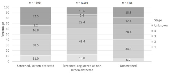 Cancer stage distribution in unscreened, screened non-screen detected and screened, screen detected groups.