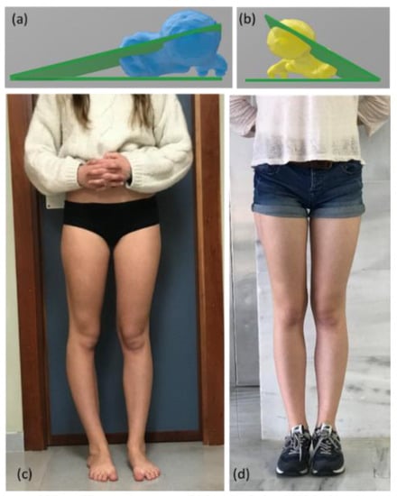 Image of the measurement of the femoral anteversion of the healthy side ((a), in blue) and the pathological side ((b), yellow) using the technique described by Georgiadis in a 3D program []. Both femurs take the femoral neck axis and the posterior intercondyle line as a reference to measure the femoral torsion. (c) Clinical pre-operative image. The right leg shows a clear torsion abnormality. (d) Post-operative image. Both legs were properly aligned. Clinically, the patient is completely asymptomatic.