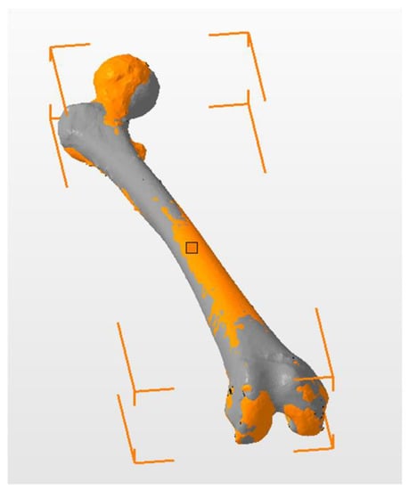Manual overlap of both femurs. The healthy side is gray, and the pathological side is orange. The color code of this image does not represent a quantitative scale of differences. The aim of this image is to show where the two femurs overlap.
