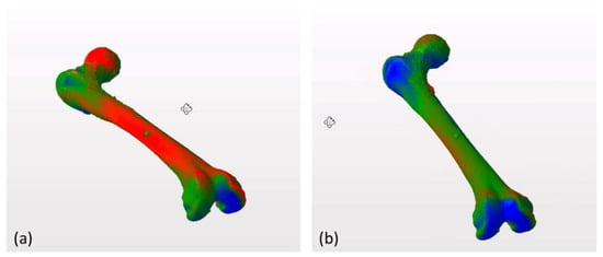 Overlapping of both femurs of one patient using automatic alignment tools (a). Manual alignment of the same femurs using the horizontal plane as a common reference point, following the table top method [] (b). The pattern of discrepancies between femurs changes significantly depending on the alignment tool used. In the image on the right (b) the similarity between both femurs is greater than in the image on the left (a) because they are aligned using common anatomical landmarks for comparison, which allows us to detect areas of anatomical variability between both structures.