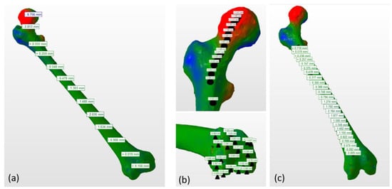 Measurement of the discrepancy between two femurs along the longitudinal axis of the femur. (a) General view. (b,c) Details of the proximal femur, femoral diaphysis, and distal femur. Note that the two distal femurs match almost perfectly, while the diaphyseal and proximal femurs do not match due to the rotational deformity. Color legend: the more green the color is, the less difference between both femurs. The redder the color is, the greater the positive difference between both femurs and the more blue the color is, the greater the negative difference between both femurs. After aligning both femurs manually, reference points were noted at a regular interval distance as shown in the images.