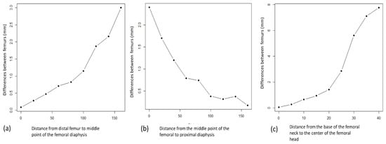 (a) Progressive increase of the deformity at the level of the distal femoral diaphysis to its apex, at the middle third level of the femoral diaphyseal, with lineal behavior (p < 0.01). The intervals between measurements are regular so the increase in the discrepancies between the measured points is due to the increase in the asymmetry between the femurs. (b) Progressive reduction of the deformity between the proximal femoral diaphysis level from its middle point, at the middle third level of the femoral diaphyseal and the proximal femur, with lineal behavior (p < 0.01). (c) Progressive increase of the deformity at the femoral neck level from the base, with lineal behavior (p < 0.01).