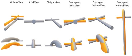 The 3D model was obtained after rendering (3D Slicer® version 4.6.2, 3D Slicer Organization—Meshmixer® version 3.5.474, Autodesk, San Rafael, CA, USA). The specular image of the left femur was obtained for comparison with the right femur (3D Builder, Microsoft Corporation® Redmond, WA, USA, version 18.0.1931.0). Then we drew a horizontal plane and located the contact points of the two femurs in the horizontal plane (MeshLab® Visual Computing Laboratory, Pisa, Italy) []. This process enabled us to manually select the connecting points of both femurs. We used the horizontal plane because it is one of the planes used to define the femoral anteversion. Then, we manually overlapped the images of the two femurs (Figure 2). In a previous study, we analyzed the great importance of overlapping the images manually [] (Figure 3).