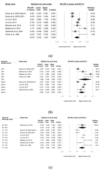 We performed subgroup analyses. In these analyses, samples were segmented by d-serine source (e.g., serum or CSF), mean age range, or AD diagnostic criteria. We conducted subgroup analyses when at least two independent data sets were available [41]. Furthermore, metaregression analyses were performed for each potential moderator.
