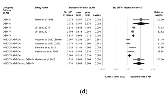 In two studies, codes from the Diagnostic and Statistical Manual of Mental Disorders, Fourth Edition (DSM-IV) were used as diagnostic criteria [27,28] and in three trials, the NINCDS-ADRDA Alzheimer’s Criteria were used as diagnostic criteria [25,26,29]. In one study [22], both the NINCDS-ADRDA Alzheimer’s Criteria and DSM-IV codes were employed as diagnostic criteria. The subgroup analyses showed that d-serine levels in AD group diagnosed using DSM-IV codes were significantly higher than those in control group (SMD = 0.837, 95% CI = 0.663 to 1.012, p < 0.001). d-serine levels in AD group diagnosed using the NINCDS-ADRDA Alzheimer’s Criteria were higher than those in control group, but non-significantly (SMD = 0.261, 95% CI = −0.018 to 0.539, p = 0.066; Figure 2d).