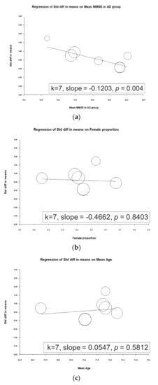These findings agree with those of most related studies. Four of the studies reported significantly higher d-serine levels in patients with AD than in controls [22,24,27,28]. Two studies did not report significant differences between d-serine levels between these groups [25,26]. Furthermore, contradictory findings were obtained by Hashimoto and colleagues [29]. In their study, serum d-serine levels in AD group were lower than in normal controls, but the difference was non-significant (AD group: 1.88 ± 0.51 µM, control group: 2.14 ± 0.65 µM (p = 0.078)). In the work of Hashimoto and colleagues, this discrepancy may have been due to several factors. First, AD severity may be associated with d-serine level. Trials with lower MMSE scores tended to report significant differences. For example, in Lin’s study, the mean MMSE score in the AD group was 15.9 ± 4.3. However, trials in which participants had high MMSE scores tended to not report significant differences. In Nuzzo’s, the mean MMSE score in AD group was 21.2 ± 3.8. In our metaregression, a significant inverse association between ES and mean MMSE score in AD group was noted (slope = −0.1203, p = 0.0004), meaning that the higher the mean MMSE score in AD group was, the weaker the ES (i.e., a smaller difference in d-serine level was observed between patients with AD and controls; Figure 3). Second, another possible factor is the small sample size (32 AD patients and 33 cognitive health controls) compared to 397 participants in Lin’s study [28].