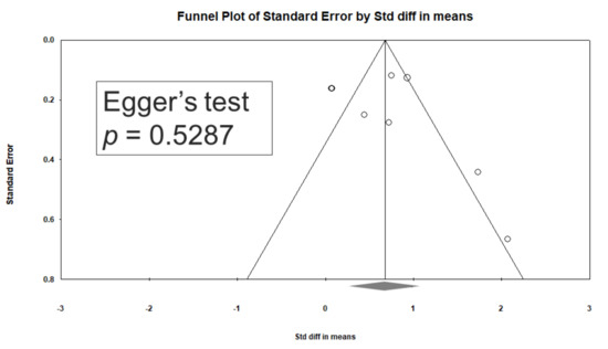 - Sterne, J.A.C.; Sutton, A.J.; Ioannidis, J.P.A.; Terrin, N.; Jones, D.R.; Lau, J.; Carpenter, J.; Rücker, G.; Harbord, R.M.; Schmid, C.H.; et al. Recommendations for examining and interpreting funnel plot asymmetry in meta-analyses of randomised controlled trials. BMJ 2011, 343, d4002. [Google Scholar] [CrossRef]