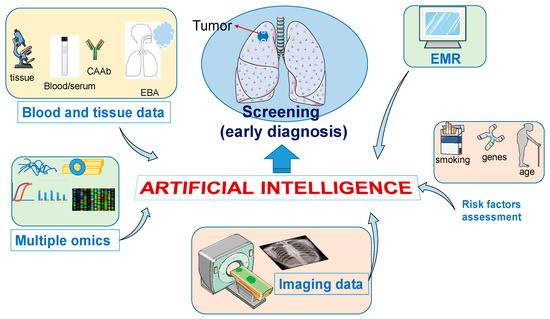 By integrating multiple data, AI algorithms have the potential to improve the early diagnosis of lung cancer. The utility of AI tools interpreting medical images has been demonstrated in several settings and in several diseases, including lung cancer. However, the usefulness of AI in contributing to the early diagnosis of lung cancer may extend beyond the interpretation of lung images. For example, blood samples are currently interrogated for the presence of circulating autoantibodies (CAAb), microRNAs, and various serum biomarkers, and some of these factors appear to be associated with lung cancer, thus AI could aid in the identification of specific patterns or signatures typical of lung cancer. Similarly, the presence of distinct patterns in exhaled breath analysis (EBA) are currently being studied for its utility in lung cancer diagnosis, and data from Electronic medical records (EMR), which constitutes a formidable source of clinical, demographic, and biometric data, coupled with AI algorithms could be a powerful diagnostic tool. Finally, high-throughput technologies such as metabolomics, transcriptomics, epigenomics, and the integration of multiple “omics” together with information from medical images and clinical data will provide insightful information for the understanding of human diseases, including lung cancer.