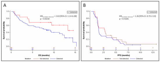 Median follow-up was 11.4 months. Detection of a mutation in circulating DNA was associated with a poor prognosis in OS (HRmutation detected = 2.63 (95% CI: 1.14–6.08) p = 0.0238; Figure 1A) after adjustment for the stratification factors (sensitive relapse, performance status, stage, and gender). Median OS was 7.6 months in the presence of a detectable mutation, versus 13.3 months in the absence of a detectable circulating mutation. This prognostic value was independent of the nature of the treatment, after adjustment for the stratification factors and treatment arm (HRmutation detected = 2.60 (95% CI: 1.11–6.08) p = 0.0272). The detection of a mutation in circulating DNA was not correlated with PFS (HRmutation detected = 1.26 (95% CI: 0.72–2.21) p = 0.4106; Figure 1B). None of the mutated genes taken individually showed any association with PFS or OS.