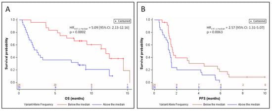 The relative abundance of tumor DNA in plasma was estimated by the variant allele fraction (VAF) of the somatic mutations identified in circulating DNA (in cases where several mutations were identified, the highest VAF was considered). Among the samples from 49 patients for whom a somatic mutation of TP53, RB1, or NOTCH1–3 was identified in circulating DNA, ctDNA represented 2.8% to 95.5% of the total amount of circulating DNA, with a median relative abundance = 44.5%. The detection of ctDNA at a relative abundance greater than this median value was significantly associated with a poor prognosis in terms of OS (HRVAF≥median = 5.09 (95% CI: 2.13–12.16) p = 0.0002; Figure 2A) and of PFS (HRVAF≥median = 2.57 (95% CI: 1.31–5.07) p = 0.0063; Figure 2B) after adjustment for the stratification factors. Median OS was 2.5 months for patients whose ctDNA was at relative abundance greater than the median (95% CI: 1.4–8.1), versus 12 months for patients whose ctDNA was detectable at less than or equal to the median relative abundance (95% CI: 6.6–15.3). Median PFS was 1.3 months for patients whose ctDNA was above the median relative abundance (95% CI: 1.1–1.5), versus 1.6 months for patients whose ctDNA was detectable at relative abundance less than or equal to the median (95% CI: 1.3–3.1). The prognostic value of relative ctDNA abundance was independent of the nature of the treatment, after adjustment for the stratification factors and treatment arm (OS: Adjusted HRVAF≥median = 5.59 (95% CI: 2.30–13.58) p = 0.0001; PFS: Adjusted HRVAF≥median = 2.94 (95% CI: 1.48–5.83) p = 0.0020). Interpreted as a continuous variable, relative ctDNA abundance remained a prognostic factor in OS and PFS according to a Cox model adjusted on the stratification factors (for OS: HR = 1.033 (95% CI: 1.016–1.05) p = 0.0001; for PFS: HR = 1.015 (95% CI: 1.003–1.027) p = 0.0163).