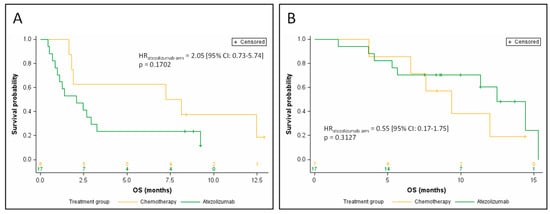 Conversely, in the 24 patients whose relative ctDNA abundance was below or equal to the median (7 patients treated with chemotherapy, 17 patients treated with atezolizumab), patients treated with atezolizumab had a longer OS than in the chemotherapy arm in univariate analysis, although the difference did not reach statistical significance (HRatezolizumab arm = 0.55 (95% CI: 0.17–1.75) p = 0.3127; Figure 3B). Median OS was 9.0 months for the atezolizumab arm versus 5.0 months for the chemotherapy arm.