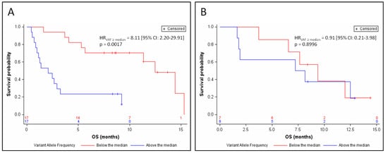 Kaplan–Meier estimates of overall survival (A) and progression-free survival (B), depending on relative ctDNA abundance (below or above the median).