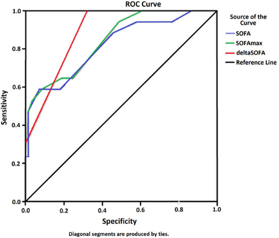 The overall mortality rate observed in patients with severe malaria was 16.8%, lower than that predicted by the average scores of SOFA and SOFAmax. Figure 3 shows that the ROC curves for these two variants of the SOFA score were significant and similar (mean SOFA AUC 0.820, SOFAmax AUC 0.845; 95% CI). Figure 3 also includes a third variant of SOFA that shows better sensitivity (deltaSOFA AUC 0.887; 95% CI).