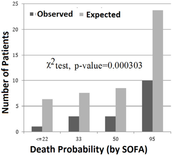 In reality, the mortality observed in patients with severe malaria is much lower than the number of expected mortality predicted by the SOFA score. Figure 4 shows the distribution of observed deaths versus expected deaths predicted by the average SOFA score, estimated by the values of probability of death calculated directly using the calculator available at http://clincalc.com/icumortality/sofa.aspx. The difference between observed and expected deaths was greater in the most critical patients (χ2, p <0.001) included in the group, with a 95% probability of death, calculated from the average SOFA score.