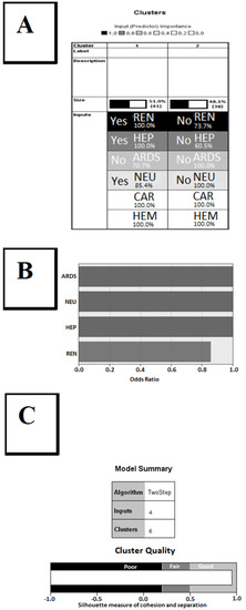 Subsequently, a two-step cluster analysis was run using SPSS 21 software in order to discriminate sampled patients (n = 101) with severe malaria according to the presence or absence of the six organic disorders used to estimate the SOFA score. Figure 5A shows the two homogeneous clusters obtained on the first run, indicating that two of the organic disorders, cardiac and hematological dysfunction, did not present discriminatory power in the studied group. In addition, a second run of two-step cluster analysis (n = 101) was performed using only the four organic dysfunctions detected as having discriminant power (excluding the two organic disorders CAR and HEM that showed no discriminating power in the first run) in order to reduce the background noise of the previous analysis. Thus, Figure 5B shows the discriminating power of the four organ disorders (renal, neurological, cardiac, and ARDS), quantified as odds ratios, which detected six homogeneous clusters and one cluster with atypical behavior that included cases that could not be classified in the six main clusters. Figure 5C demonstrates the “good” quality of the aggregation of cases in clusters in terms of both the cohesion of cases within each cluster and separation between clusters. It is thus demonstrated that the sample is not homogeneous and that further analysis of mortality should consider this information.