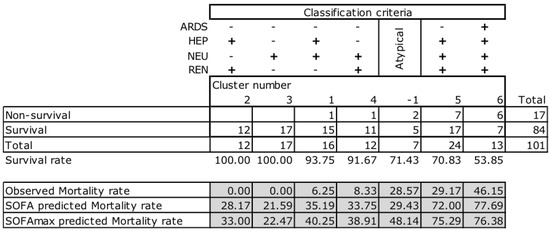 Classification criteria of the 6 + 1 clusters, and mortality distribution within each cluster. Survival and mortality rates are shown in % of total cases observed (n = 101). Each column represents a numbered cluster (1–6) and one atypical cluster numbered by the software as −1. The classification criteria defining each cluster is indicated at the top of each column/cluster for the 4 different organ dysfunctions (n = 101; CAR and HEM not in use) that are relevant.