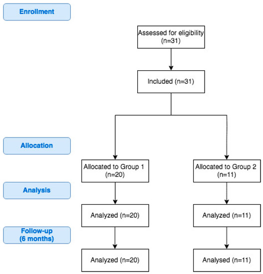 The study group consisted of 31 patients; 20 (64.5%) were included in Group 1 and 11 (35.5%) were included in Group 2. No participants were lost during the 6-month follow-up period of the study. A flowchart of the study is presented on Figure 1. The mean age of patients included in this study was 43.5 years ± 12.3 years. Overall, 20 (64.5%) participants were female. Median maximal weight was 132 kg (122.5–151 kg), median maximal BMI was 47.3 kg/m2 (43.6–52.5 kg/m2) and median preoperative BMI was 44.1 kg/m2 (40.7–48.3 kg/m2). We did not identify significant differences in the above-mentioned parameters between the groups. Additional demographic characteristics are presented in Table 1.
