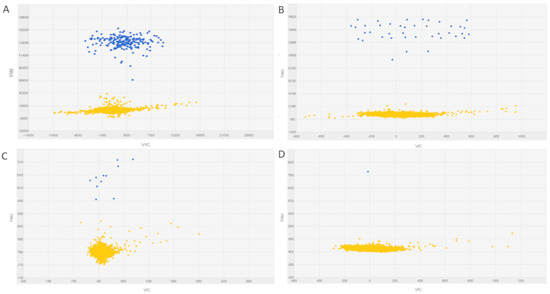Examples of dilutions of BCR-ABL1 transcript detected by QuantStudio three-dimensional (3D) digital PCR platform. Blue dots represent the micro-reactions positive for BCR-ABL1. Yellow dots represent the micro-reaction negative for the presence of BCR-ABL1. (A) Detection of 200 copies of BCR-ABL1 transcript. (B) Detection of 50 copies of BCR-ABL1 transcript. (C) Detection of 10 copies of BCR-ABL1 transcript. (D) Detection of one copy of BCR-ABL1 transcript.