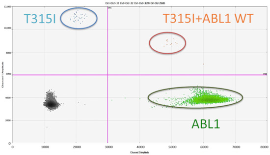 On the other hand, dPCR has been considered as a complementary or even alternative method. In the hematological scenario, dPCR has already been employed for detection of hotspot mutations in many genes, such as JAK2 [19], IDH1/IDH2 [63,64], MYD88 [65], B-RAF [18,66], and c-KIT [67]. Each dPCR assay enables the detection of a given mutation by using specific primers and probes. However, this limitation, which results in the possibility to interrogate a limited number of key sequence positions, is counterbalanced by the advantages of dPCR over NGS. While the latter is more expensive and time-consuming and requires specific skills for both library preparation and data analysis (which limits NGS use to medium- to large-scale reference laboratories), dPCR is cheap and simple and guarantees a much shorter turnaround time. As anticipated above, each first- (imatinib) and second-generation (dasatinib, nilotinib, bosutinib) TKI exhibits a small, specific spectrum of resistant ABL1 mutations, and none is active against the “gatekeeper” T315I mutation, which can only be overcome by the third-generation TKI ponatinib [4]. Thus, the identification of this key ABL1 mutation has relevant clinical implications, because it must lead to an immediate switch from the ongoing TKI to ponatinib [2]. Small clones with the T315I mutation have recently been backtracked by using dPCR in patients with Philadelphia chromosome-positive acute lymphoblastic leukemia who received allogeneic stem-cell transplantation following dasatinib plus intensive chemotherapy. In this series of patients, the cumulative incidences of molecular and hematological relapse at 3 years were 60.3% and 25.1%, respectively [68]. All patients with the T315I mutation at molecular relapse rapidly experienced hematological relapse, whereas only two of the 10 patients without the T315I mutation had hematological relapse. This study suggests that dPCR can also be an effective and sensitive method for the detection of the T315I mutation in the setting of CML [68] (Figure 3).
