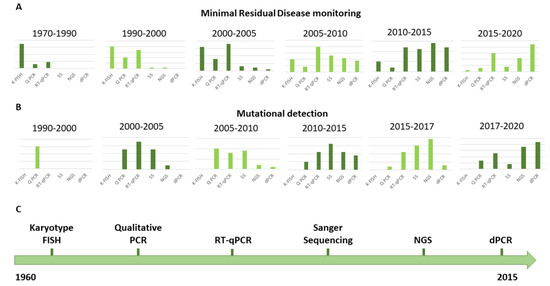 Evolution of the technologies for MRD and mutational status evaluation in CML patients. (A) The graphs report the number of publications referring to the application of different technologies for MRD monitoring in CML patients over the past 60 years. (B) The graphs report the number of publications referring to the application of different technologies for mutation detection in CML patients over the past 30 years. (C) The timeline reports the sequential introduction of different techniques for the MRD monitoring and the detection of mutations in CML patient management. Abbreviations: FISH: fluorescent in situ hybridization; K-FISH: karyotype analysis by chromosome banding and fluorescent in situ hybridization; Q PCR: qualitative polymerase chain reaction; RT-qPCR: real-time quantitative polymerase chain reaction; SS: Sanger sequencing; NGS: next-generation sequencing; dPCR: digital polymerase chain reaction.