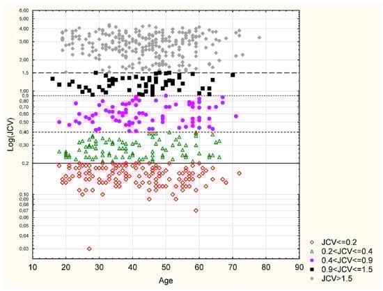 Table 5 shows anti-JCVAb index categories for the entire cohort. In a group of 434 seropositive patients, 10 (2.3%) persons had an AI between 0.2 and 0.4, 87 (20.1%) had an AI from 0.4 to 0.9, 63 (14.5%) from 0.9 to 1.5, and 274 (63.1%) patients achieved an AI of >1.5. No differences regarding the AI category by sex, disease type, EDSS score, age at disease onset, and disease duration were observed (Table 5 and Table 6). Figure 1 shows the distribution of AI values by categories depending on the age at the time of drawing the sample.