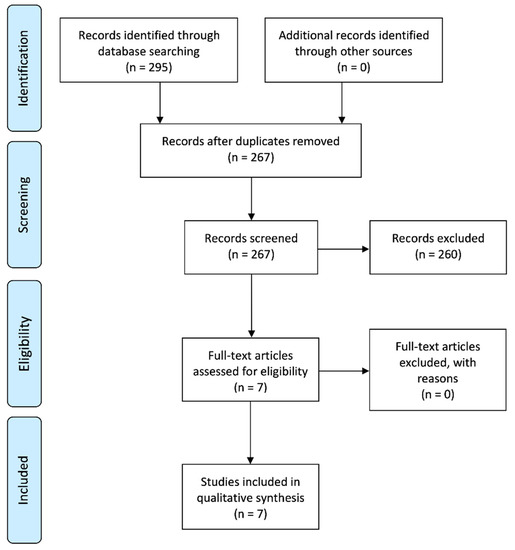 The search results and study selection process are illustrated in Figure 1. The electronic database searches identified 295 preliminary records: 178 from Scopus, 67 from Medline, 39 from Web of Science, and 11 from Embase. The search performed in SciELO database yielded no results. No additional eligible studies were found upon screening the references of the resulting studies. Duplicates were manually discarded by means of the reference manager software, resulting in 267 records. From these, 260 were excluded upon reading the title and abstract. The resulting seven papers were evaluated by full-text screening, and all of them were eligible for qualitative synthesis.