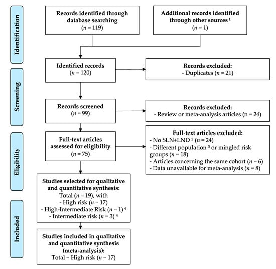 Bibliographic selection flow diagram according to the PRISMA statement. 1 The other source was the bibliography of a review article on the topic. 2 Sentinel lymph node (SLN) procedure followed by lymph-node dissection (LND). 3 Not high, high-intermediate, or intermediate risk groups. 4 Intermediate and high-intermediate risk groups were excluded from the analysis because there were too few studies to analyze. Some articles reported data for different risk groups; consequently, the sum of each risk group is above the total selected articles.