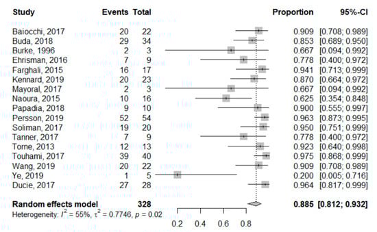 SLN sensitivity ranged from 20% [] to 97.5% []. The pooled global sensitivity was 88.5% (95%CI: 81.2–93.2%). Sensitivity for each study is reported in the forest plot corresponding to Figure 2. Heterogeneity for this analysis was moderate as the Higgins’ I2 index was 55% (p = 0.02).