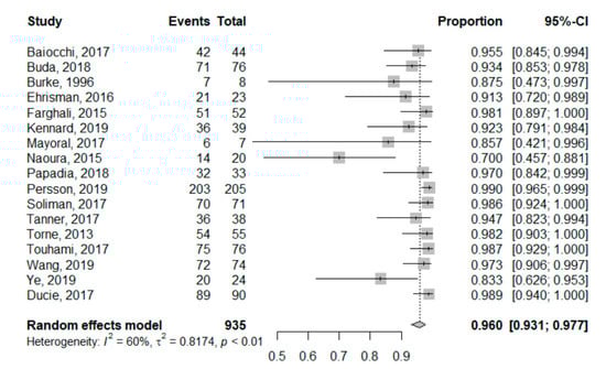 Concerning NPV, we found that it ranged from 70% [] to 99% []. The pooled global NPV was 96.0% (95%CI: 93.1–97.7%). NPV for each study is reported in the forest plot corresponding to Figure 3. Heterogeneity for this second analysis was higher, although still moderate, as the Higgins’ I2 index was 60% (p < 0.01).