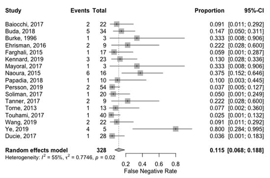 Global False Negative Rate (FNR) ranged from 2.5% [] to 80% []. The pooled FNR was 11.5% (95%CI: 6.8%; 18.8%). FNR for each study is reported in the forest plot corresponding to Figure 4. Heterogeneity for this analysis was moderate as the Higgins’ I2 index was 55% (p = 0.015).