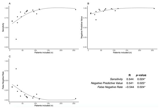Then, we studied if SLN performances were associated with the population size of each study (Figure 5). Interestingly, we found that sensitivity and NPV are positively correlated with the number of patients included (p = 0.024 and p = 0.025, respectively), while FNR is inversely correlated (p = 0.024).