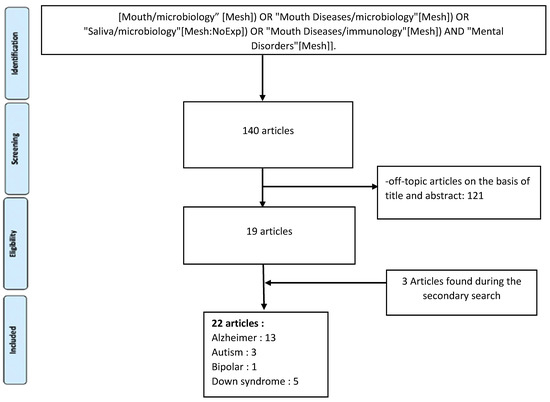 An electronic search was conducted through the MEDLINE (PubMed) database to identify publications that met the inclusion criteria. High-throughput sequencing techniques for genetic material developed in the 2000s have led to a better understanding of the nature of host–microbiota interactions, the interactions of microorganisms with each other, and their impact on health [42]. That is why the search was performed from 2000 up to June 2020, in order to identify the studies that explore the role of the oral microbiome in the pathophysiology of mental health disorders, using the following search terms and keywords alone or in combination with the Boolean operator “AND”/ “OR” according to the following equation [Mouth/microbiology [Mesh]) OR “Mouth Diseases/microbiology”[Mesh]) OR “Saliva/microbiology”[Mesh:NoExp]) OR “Mouth Diseases/immunology”[Mesh]) AND “Mental Disorders”[Mesh]].