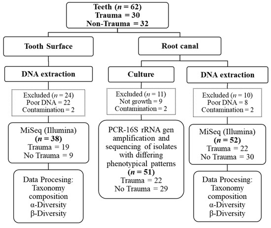 For root canal samples, the access cavity was prepared with a sterile carbide bur, canals were gently filed with K-files (Dentsply Sirona Endodontics), and filled using a syringe containing sterile saline solution. The contents of the root canal were absorbed into sterile paper points and transferred to FTM. The paper points were moved to TE-buffer (1 mL) and ten-fold serial dilutions (0–104) were cultured on fastidious anaerobic agar (FAA, Svenska LABFAB, #ACU-7531A) in an anaerobic atmosphere (5% CO2, 10% H2, 85% N2, 37 °C) for one week. Colony-forming units (CFU) were counted, and colonies with different phenotypic patterns were selected from each plate for bacterial typing. Two colonies of each phenotypic pattern were collected. The remaining sample (800 µL) containing the paper points was stored at −80 °C for DNA extraction. The experimental workflow is presented in Figure 1. Up to 10 isolates with different phenotypic patterns were selected from each plate, amplified by PCR, and sequenced to identify bacterial species as previously described [13]. Thus, aliquots of the 16S rDNA PCR products were purified and sequenced with Sanger (Eurofins MWG Operon, Ebensburg, Germany), and sequences were compared with the eHOMD database (Expanded Human Oral Microbiome Database, Forsyth, (http://www.ehomd.org)).