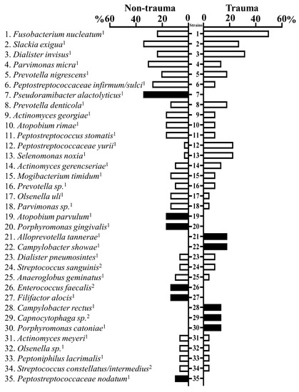 Fusobacterium nucleatum and Slackia exigua were the most prevalent species from root canals identified by culture. The bar chart shows percentages of teeth (trauma and non-trauma) containing the most common species identified by 16S rDNA Polymerase Chain Reaction sequenced. Anaerobic species are marked by the superscript “1” and species with respiratory metabolism (aerobic, microaerophilic, and facultative anaerobic) are marked by the superscript “2”.