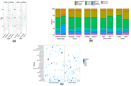 Illumina MiSeq sequencing showed an overall high microbial diversity. (a) Boxplot of alpha-diversity indices indicate a great richness of the studied bacterial communities. (b) Taxonomical composition of phyla of bacterial communities in root canal samples grouped by sample origin, history of trauma, age, tooth location, and gender. (c) Root canal community profile at genus level based on bacterial prevalence.