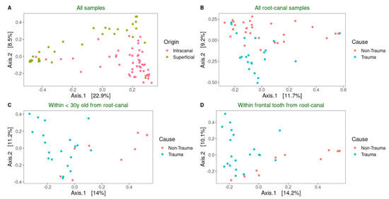 To measure differences between microbial communities, Principal coordinate analysis (PCoA) plots of the beta diversity were used and significant differences for each of the comparisons were calculated based on PERMANOVA. When this was applied on all samples in this study together, it was clear that samples recovered from surface controls clustered separately from samples from the root canals (PEMANOVA, p ≤ 0.001) (Figure 4A). To reveal if there was a difference between trauma and non-trauma teeth within the root canal samples, those groups were analyzed separately (Figure 4B). To elucidate the difference between trauma vs. non-trauma without the effects of age and tooth-position, community compositions were compared only with samples from the age-group of below 30 (Figure 4C), and only with samples from the frontal tooth position (Figure 4C). Moreover, it is known that the oral microbiota composition of supragingival plaque is affected by tooth position [27] and age [28,29]. In both cases, significant differences between the trauma and non-trauma samples were observed within <30-years-old group (PEMANOVA, p < 0.001 ****) and frontal tooth (PEMANOVA, p < 0.001 ****) from root canal samples. Other factors such as presence of fistula, subjective pain, and gender did not separate the samples distinctly. Moreover, when analyzing only traumatized teeth, the microbiota profile of teeth with complete root development did not group distinctly from teeth with incomplete root development. Similarly, lapse time between trauma and root canal treatment (<6 months, 6–12 months, and >12 months) did not influence the bacterial composition profile in traumatized teeth.