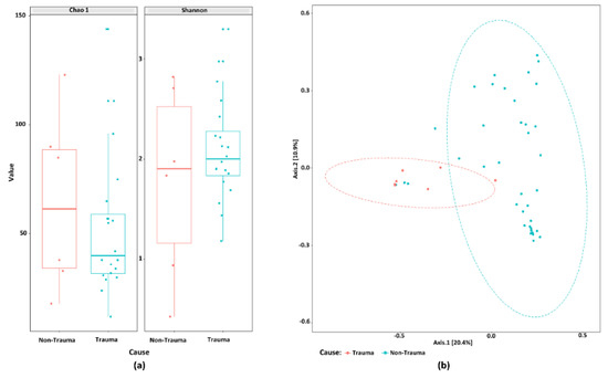 The microbiome composition from root canal samples that are frontal and below 30-years-old discriminates traumatized teeth from other primary infected non-traumatized teeth. (a) Boxplot of alpha-diversity indices of the studied bacterial communities in these samples. (b) Principal coordinate analysis (PCoA) score plots of bacterial community composition when age and tooth position are considered in the analysis. Ellipses drawn based on the multivariate t-distribution of the samples.