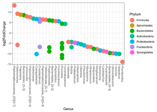 The differential abundance test analysis showed a clear difference in microbiota composition between trauma and non-trauma teeth as displayed in Figure 6. Accordingly, being in the trauma group was significantly associated with higher levels of Peptostreptococcaceae yurii and Selenomonas noxia, while Paenibacillus glucanolyticus and Atopobium sp._HMT_199 were associated with non-trauma teeth (Figure 6, Table S2). Further, 18 species were associated with trauma teeth while 30 species were associated with non-trauma teeth. Notably, F. nucleatum ssp. Polymorphum, with a crucial role as “bridging” microorganisms [30], and Corynebacterium matruchotti, recently described as “hedgehog” structure of biofilm formation [31], were significantly associated with traumatized teeth.