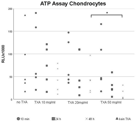 ATP assay of chondrocytes cultured in monolayers after treatment with 0 mg/mL, 10 mg/mL, 20 mg/mL and 50 mg/mL of tranexamic acid for varying exposure times. Chondrocytes from five different donors were seeded in cell culture flasks, incubated in cell culture medium and grown to confluency. After reaching confluency, cells were exposed to 0 mg/mL (no TXA), 10 mg/mL, 20 mg/mL or 50 mg/mL of TXA. The exposure time varied from 10 min to 24 h to 48 h. Chondrocyte proliferation was evaluated using the ATP assay. Each dot represents a single value from all five examined donor samples after treatment with different concentrations of TXA for indicated exposure times. * Significant difference (p < 0.05) compared to control samples. TXA, tranexamic acid; min, minutes; d, days; h, hours.