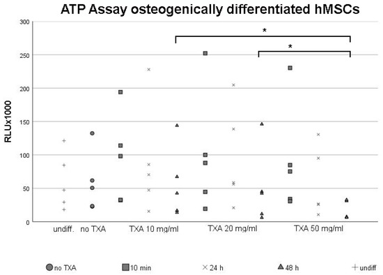 ATP assay of mesenchymal stromal cells following osteogenic differentiation and treatment with 50 mg/mL tranexamic acid for varying exposure times. Osteogenic differentiation was induced in primary hMSCs harvested from five different donors using an osteogenic differentiation medium for 21 d. Undifferentiated control samples (undiff.) were maintained for comparison. After 21 d of osteogenesis, MSCs were exposed to 0 mg/mL (no TXA), 10 mg/mL, 20 mg/mL or 50 mg/m of TXA. Cells were exposed to TXA for 10 min, 24 h or 48 h. Cell proliferation was evaluated using the ATP assay. Each dot represents a single value from all five examined donor samples after treatment with different concentrations of TXA for indicated exposure times. * Significant difference (p < 0.05) compared to control samples. hMSCs, human mesenchymal stromal cells; TXA, tranexamic acid; min, minutes; d, days; h, hours.